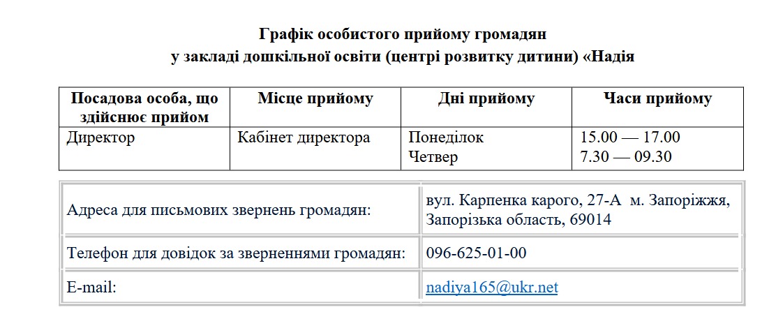 Про організацію роботи щодо унеможливлення насильства та жорстокого поводження з дітьми в закладі дошкільної освіти (центрі розвитку дитини) «Надія» Запорізької міської ради